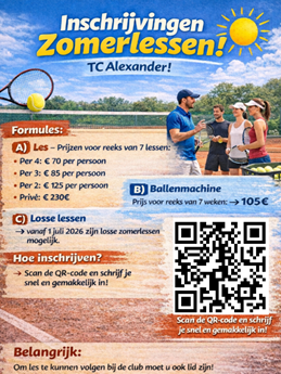 Dit kan, maar is te regelen met de lesgever zelf. Deze gaan in NA ons jaarlijks dubbeltornooi, eind juni 2026. Dus vanaf 1 juli 2026 zijn losse zomerlessen mogelijk.